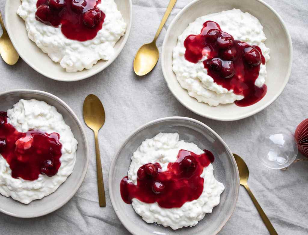 Risengrød is rice pudding or porridge. It was known for being served at Christmas until around the year 1900, when the upper class began serving Risalamande with cherry sauce for Christmas instead of rice porridge. Risalamande is made of rice pudding mixed with whipped cream, sugar, vanilla, and chopped almonds. It is served cold with either warm or cold cherry sauce (kirsebærsovs).